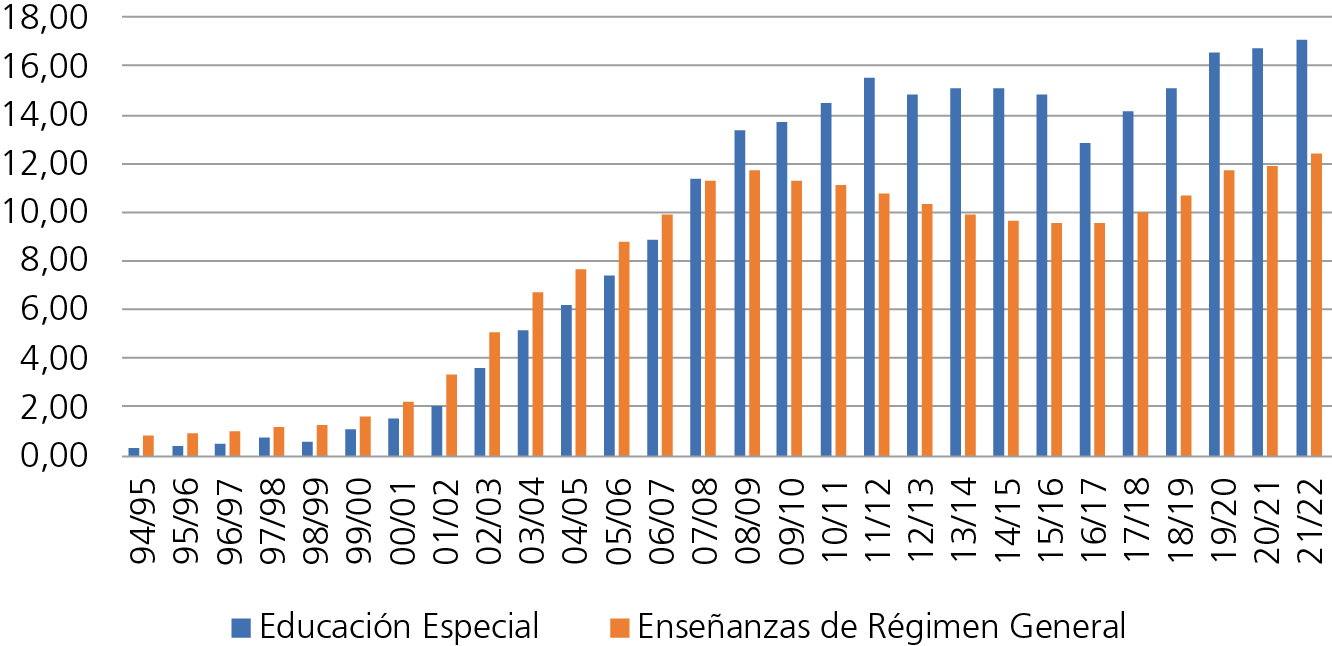 A partir del citado curso las diferencias siguieron creciendo y no han parado. En el curso 2010/11 el porcentaje en la educación especial de estos escolares eran ya del 14,47% y en el Régimen General del 11,09%, 3,38 puntos porcentuales de diferencia hacia la educación especial. En el curso 2014/15 se alcanzó la mayor diferencia. En la educación especial eran el 15,12% y en el Régimen General el 9,64%, 5,19 puntos porcentuales de diferencia que se explican no por el descenso del porcentaje en el Régimen General, sino por el porcentaje en la educación especial que seguía creciendo. En el último curso analizado (2021/22) las diferencias han disminuido ligeramente y ello por el nuevo crecimiento del Régimen General, dado que el crecimiento porcentual en educación especial no ha parado. En este curso, ya son 17,09% los de educación especial del grupo minoritario y el 12,39% los de este mismo grupo en el Régimen General.