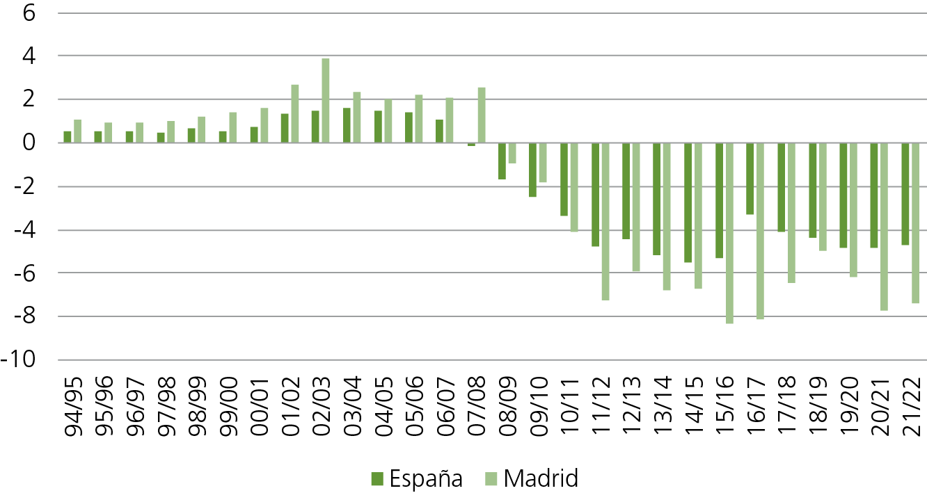Como podemos observar, las diferencias se hicieron negativas en Madrid, es decir, a favor de la Educación Especial, un curso posterior (2008/09) a cuando ocurrió para el conjunto de España. La máxima diferencia a favor de la educación especial se alcanzó en Madrid en el curso 2015/16 siendo de 8,35 puntos de diferencia porcentual a favor de la educación especial (en España en ese curso era de 5,32 puntos de diferencia porcentual). El último curso analizado (2021/22) la diferencia a favor de la educación especial era en Madrid de 7,4 puntos porcentuales cuando en el conjunto de España era de 4,69 puntos. Resumiendo, cuando en Madrid en el curso 2021/22 el porcentaje de escolares del grupo minoritario en la educación especial era del 21,63%, en el Estado español era del 17,09%, lo que muestra una clara diferencia territorial. Además, en el Régimen General en Madrid y en el mismo curso, el porcentaje de escolares del grupo minoritario era del 14,23% algo superior al del conjunto del Estado que era del 12,39%, pero que evidencia que en la Educación Especial y para el caso de Madrid la posible representación desproporcionada era mayor a la del conjunto del Estado.