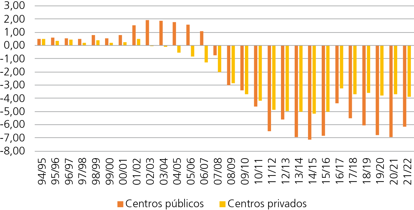 Los centros públicos empezaron más tarde a observar las diferencias a favor de la matrícula en la Educación Especial. Sería en el curso 2007/08. Alcanzó su máxima diferencia en el curso 2014/15 con más de siete puntos porcentuales de diferencias a favor de la Educación Especial. El periodo analizado terminó (curso 2020/21) con más de seis puntos porcentuales de diferencia entre el porcentaje de escolares de nacionalidad extranjera con matrícula en la Educación Especial y frente a la matrícula de esta tipología de escolares en el Régimen General.